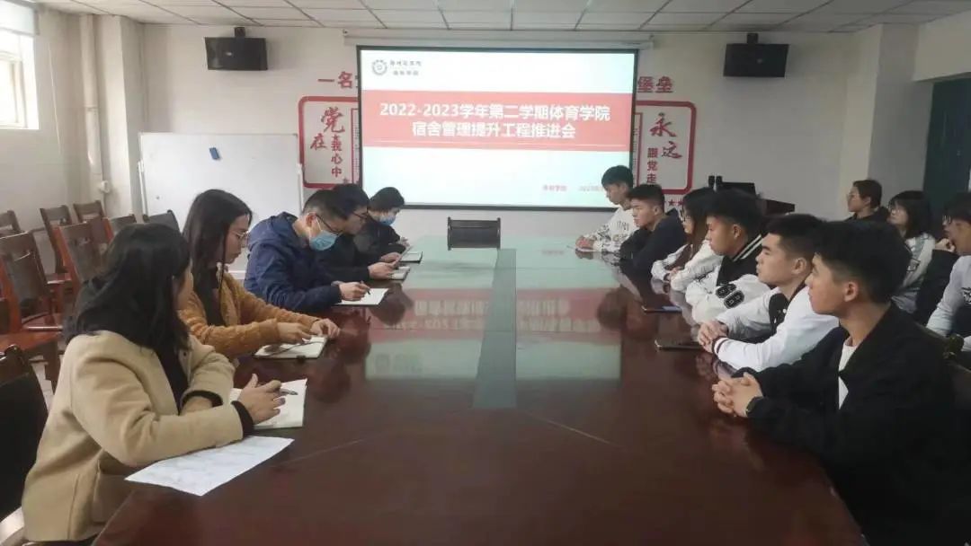 为加强宿舍管理,推进宿舍管理制度实施,体育学院于3月1日在体育馆一楼会议室组织召开了宿舍管理提升工程推进会。体育学院党委书记牛晓锋、团委书记傅锦涛、全体辅导员及各班班长参加了本次会议。
