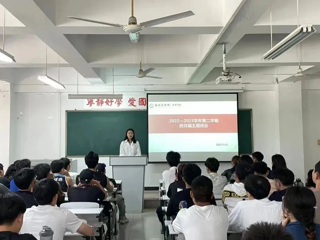 班会上,辅导员首先通过什么是电信网络诈骗,网络诈骗的特点,诈骗的辨别公式和蔓延的原因等,使同学们对网络诈骗行为有了初步了解。其次,详细阐述了电信网络诈骗的十种常用骗术,通过真实案例使同学们获得了对电信诈骗具体认知。同时对电信诈骗的规律进行了解析,并给出了常见的诈骗防范方法提示,有效加深了大家对电信诈骗的防范意识。最后介绍了上当受骗后的补救处理措施,并提醒大家应当时刻看管好自己重要的私人物品保护好私人财产。