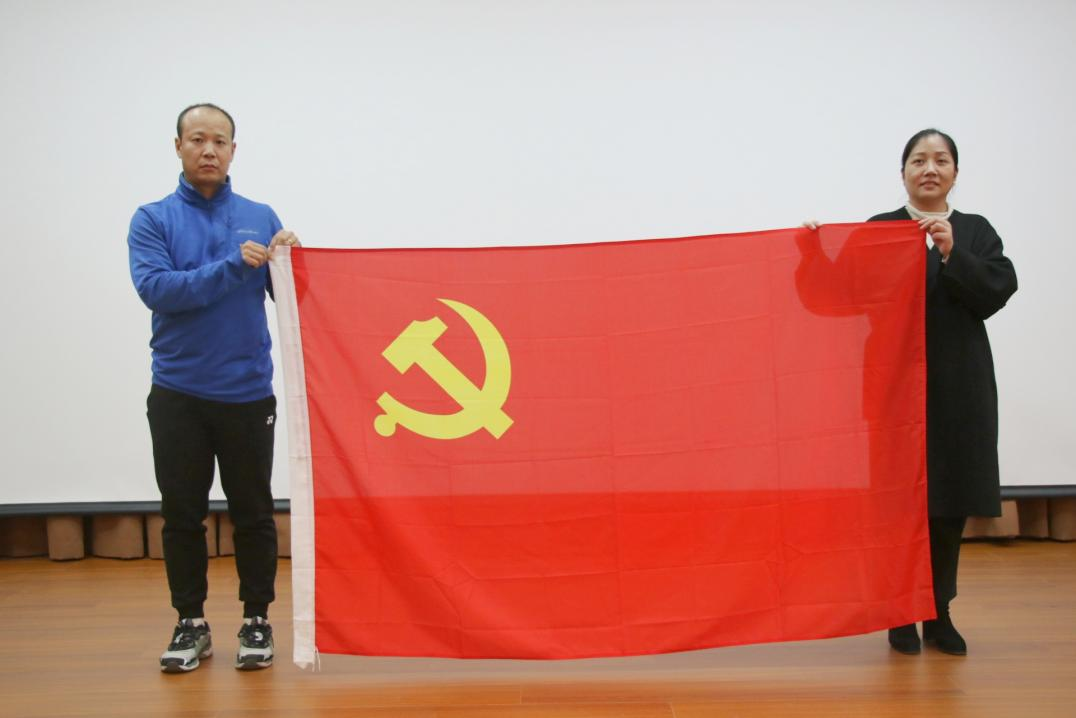 党办组织部副部长孟晗同志为校级运动队教练员临时党支部授旗,校运动队临时党支部书记赵咏同志接旗。