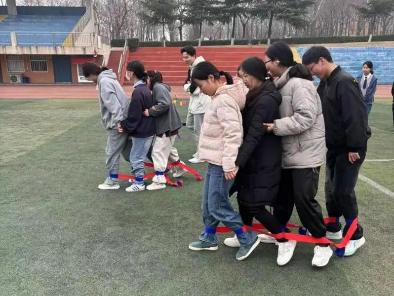 当日,校园里一片欢声笑语,一系列趣味运动项目热烈地展开了。在“众搭高塔”项目中,同学们齐心合力,稳稳地把一块块积木堆叠起来,筑起了友谊的高塔;在“同手同脚”环节,大家动作敏捷、反应迅速,按照标识缓缓前行;而“原地30s”项目则考验着每个人的平衡感,同学们屏息凝神,努力在有限时间内展现出最佳状态。此外,“珠行万里”和“巨人脚步”等活动也是各具特色,同学们在欢声笑语里团结合作,不仅拉近了彼此的距离,还在无形中增强了团队的凝聚力。