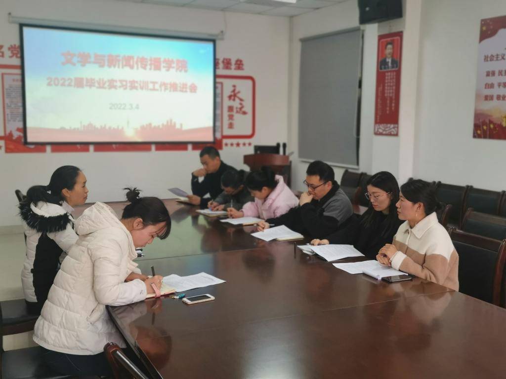 为进一步推进2022届毕业实习工作,提高实习实训管理水平和工作规范性,2022年3月4日上午,文学与新闻传播学院在自力楼101会议室召开2022届毕业生实习实训工作推进会。会议由教学秘书张慧老师主持,各毕业班辅导员、实习实训专业指导教师及学院实习实训负责人员参加了此次会议。