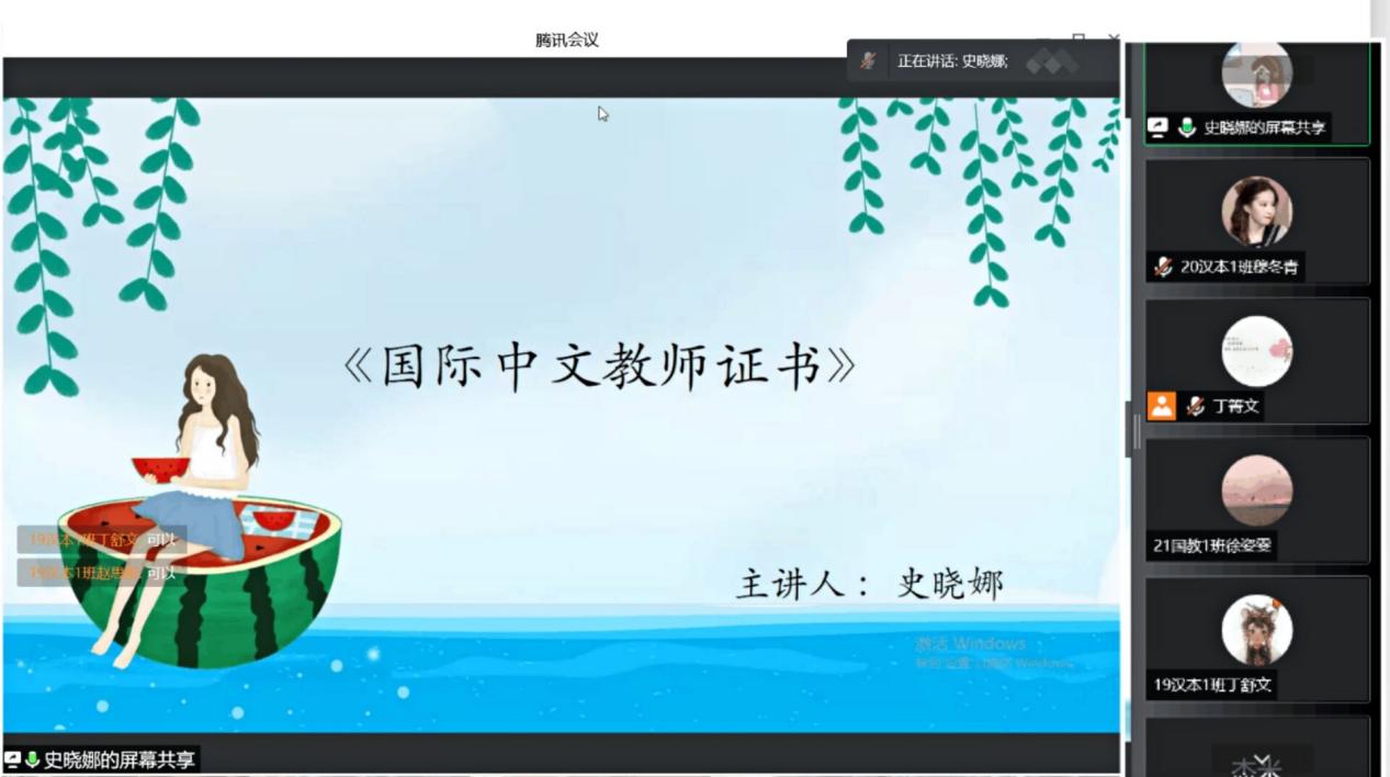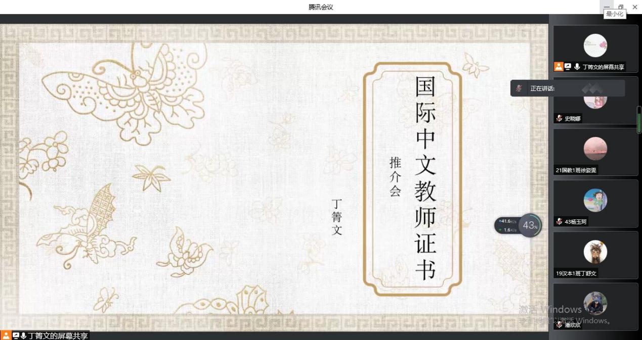为深入贯彻落实beat365分层分类教学改革,促进文学与新闻传播学院学生考取专业相关职业资格证照,拓宽就业渠道,提升就业质量,我院于3月8日以线上形式举办“国际中文教师证书推介会”。我院丁箐文老师、史晓娜老师向同学们详细介绍了证书用途、报名流程、考试试题等方面,并分享了自己的考证成功经验和备考要点。我院汉语国际教育专业及汉语言文学专业将近二百名同学参加了此次推介会。