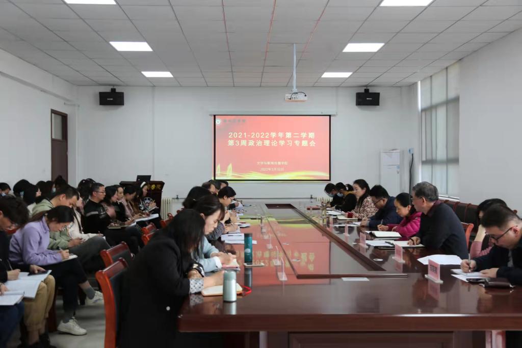 为深入学习贯彻两会精神,紧紧围绕立德树人根本任务,坚持为党育人、为国育才的初心使命,3月10日下午,文传学院组织全体无课教职工于自力楼206会议室召开政治理论学习专题会,会议由党委书记贾蓓主持。