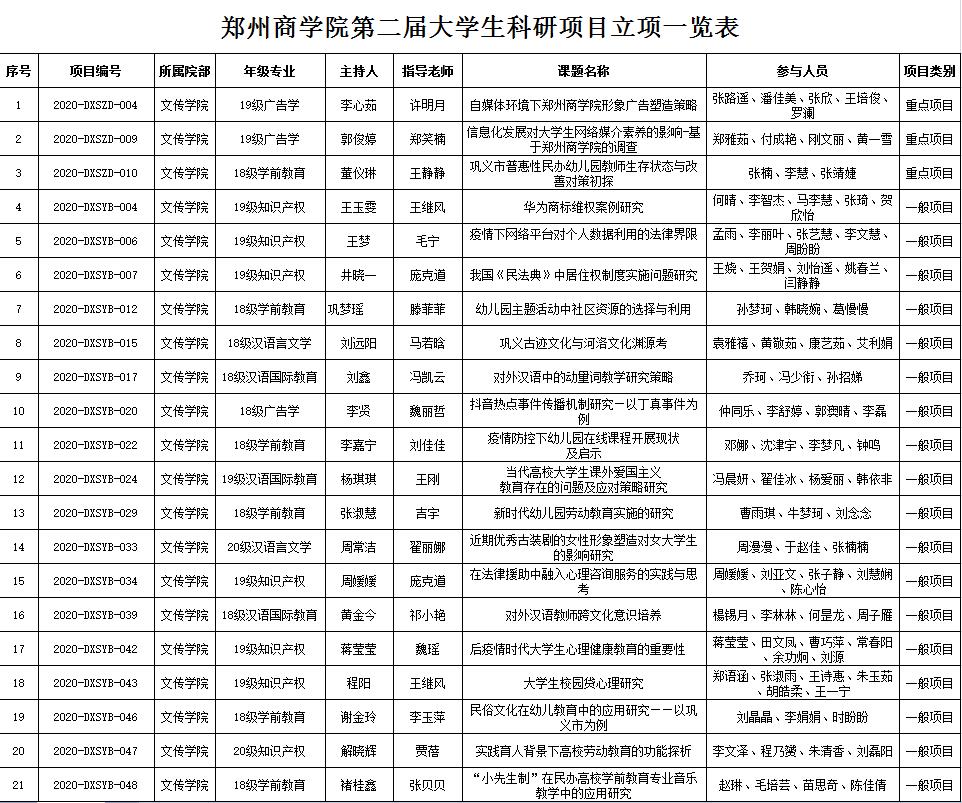 近日,beat365科研处发布公告,我院共计21项beat365唯一官网第二届大学生科研项目获批结项,其中重点项目3项,一般项目19项。