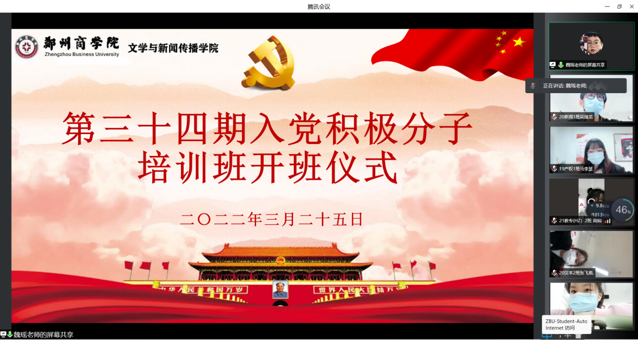 为了使入党积极分子明确入党目的,端正入党动机,并提高其自身思想政治觉悟。文传学院于3月25日下午6时通过腾讯会议举行第三十四期入党积极分子培训开班仪式暨党课第一讲。我院党委书记贾蓓,全体辅导员以及第三十四期入党积极分子参加开班仪式,此次开班仪式由党委组织委员魏瑶老师主持。