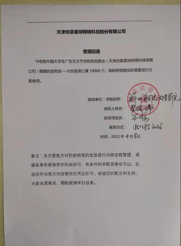 近日,中国大学生广告艺术节学院奖组委会向文学与新闻传播学院院捐赠1万只医用外科口罩,支援我院的疫情防控工作,我院在第一时间对物资进行登记,确保在疫情防控中发挥最大优势。