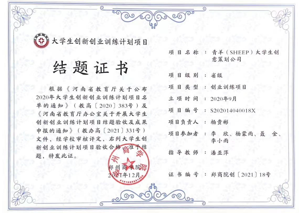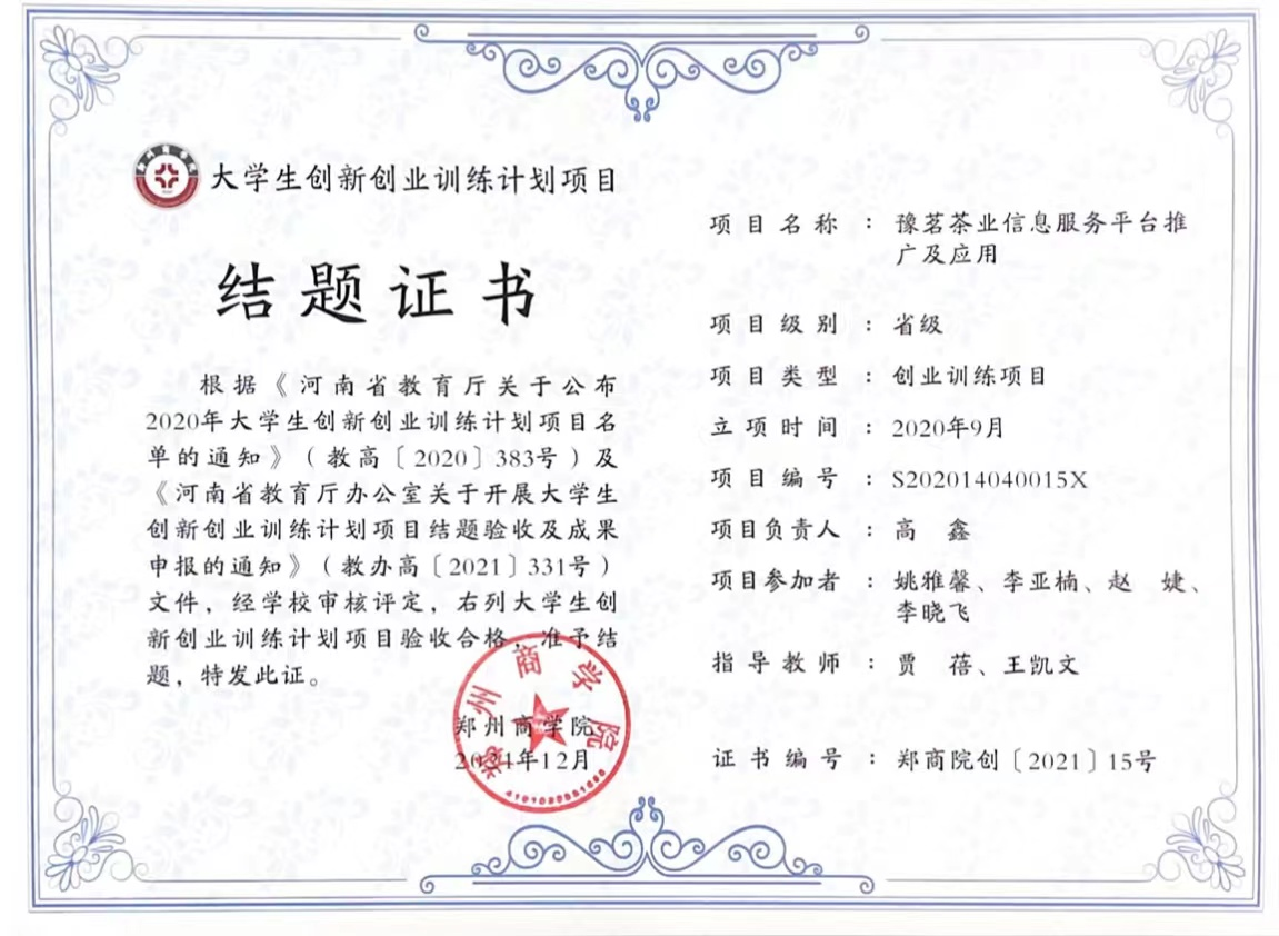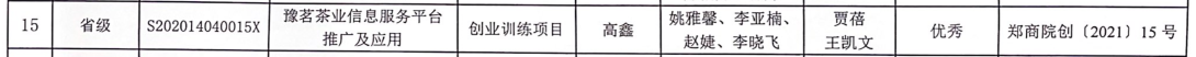 三个项目分别为:由杨贵彬主持,潘亚平老师指导的《青羊(SHEEP)大学生创意策划公司》;由王娅琳主持,郭琪老师指导的《最舒服的椅子》、由高鑫主持,贾蓓书记、王凯文老师指导的《豫茗茶业信息服务平台推广及应用》。其中“豫茗茶业信息服务平台推广及应用”在评审中获得“优秀项目”的优异成绩。此项成绩的取得,是我院持续落实“赛教融合”理念的成果,也是我院响应落实应用型人才培养的重要成果。