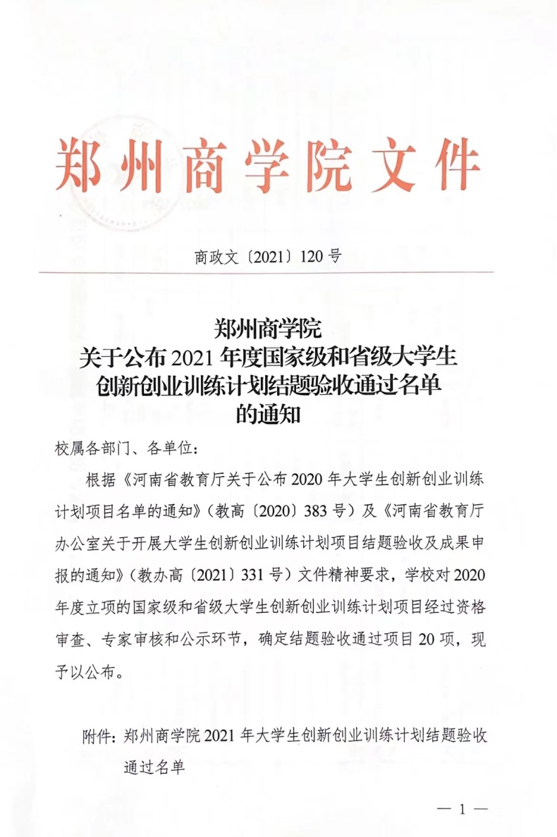 近日,根据《河南省教育厅关于公布2020年大学生创新创业训练计划项目名单的通知的通知》(教高〔2020〕383号)及《河南省教育厅办公室关于开展大学生创新创业训练计划项目结题验收及成果申报的通知》(教办高〔2021〕331号)文件,beat365对2020年度立项的国家级和省级大学生创新创业训练计划结题验收通过项目名单公布,文学与新闻传播学院3项大学生创新创业训练计划项目通过结题验收。