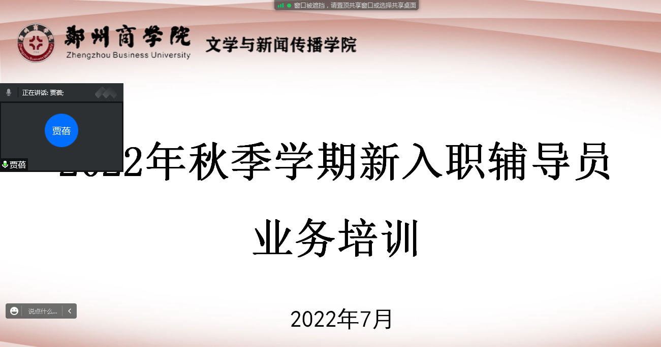 为切实提生学校新进入职辅导员的履职能力和工作水平,帮助新辅导员尽快适应岗位要求,实现角色转变,提升专业素养。7月5日下午,文传学院组织线上召开2022秋季学期新入职的辅导员业务培训。文传学院党委书记贾蓓、团委书记王凯以及新入职的辅导员共同参与此次培训。