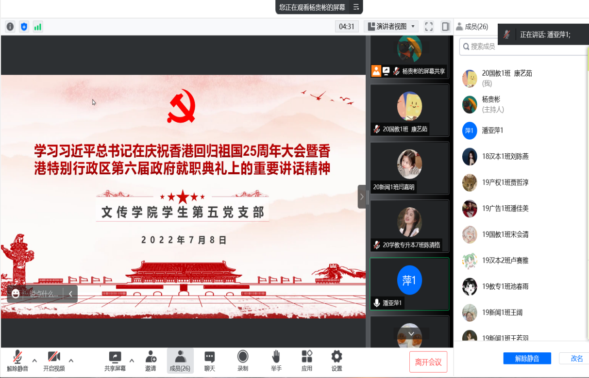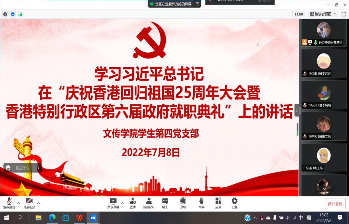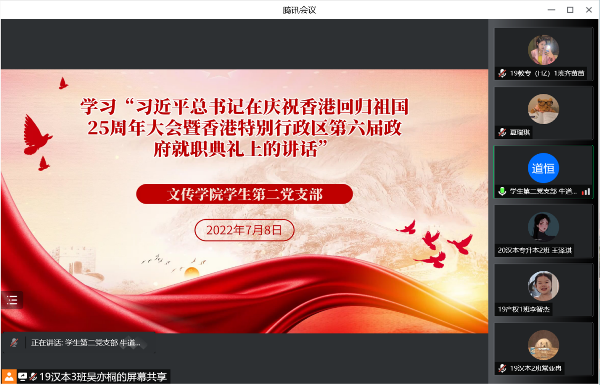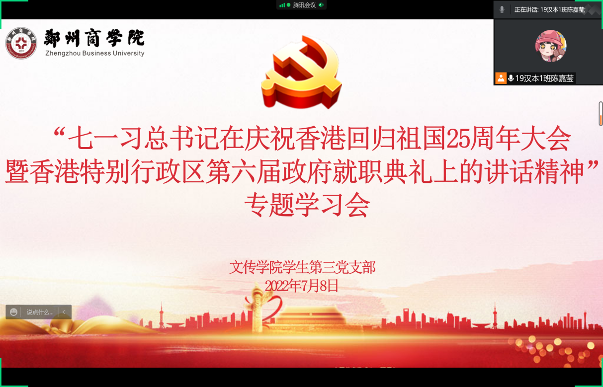 7月1日上午,庆祝香港回归祖国25周年大会暨香港特别行政区第六届政府就职典礼在香港会展中心隆重举行。中共中央总书记、国家主席、中央军委主席习近平出席并发表重要讲话。文传学院党委组织各基层学生党支部于线上观看大会直播,深入学习习近平总书记的重要讲话精神,进一步深化支部党员同志和积极分子的爱国爱港之情,更加坚定拥护“一国两制”方针。