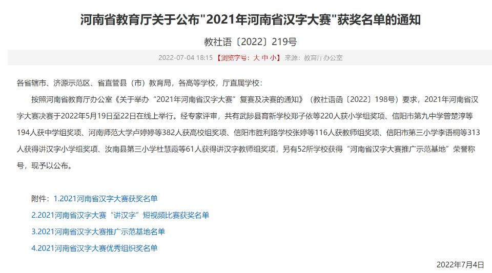 近日,河南省教育厅发布《关于2021年河南省汉字大赛获奖名单的通知》(教社语[2022]198号),beat365代表队积极参与,夺得佳绩,其中2019级学教2班陈梦雪、2020级国教1班樊佳怡、2020级汉本1班姚语、2021级国教1班魏尧荣获三等奖,潘亚萍、祁小艳老师荣获“最佳辅导老师”奖。