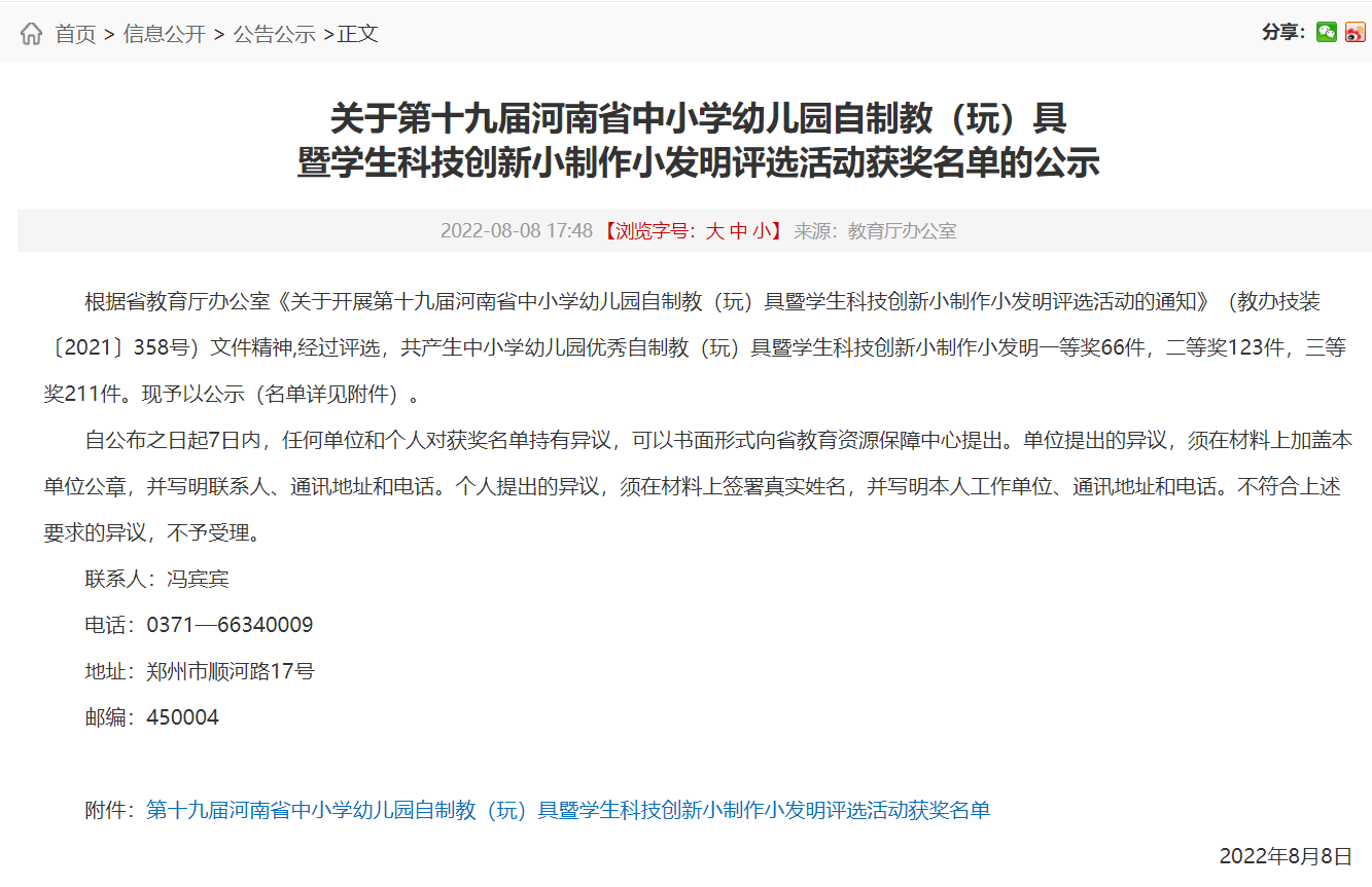 8月8日,由河南省教育厅主办的第十九届河南省中小学幼儿园自制教(玩)具暨学生科技创新小制作小发明评选活动评选结果揭晓,由我院选送的两个作品《疯狂动物城》《魔法跳跳毯》分别荣获高等学校学前教育自制教(玩)具二等奖、三等奖。