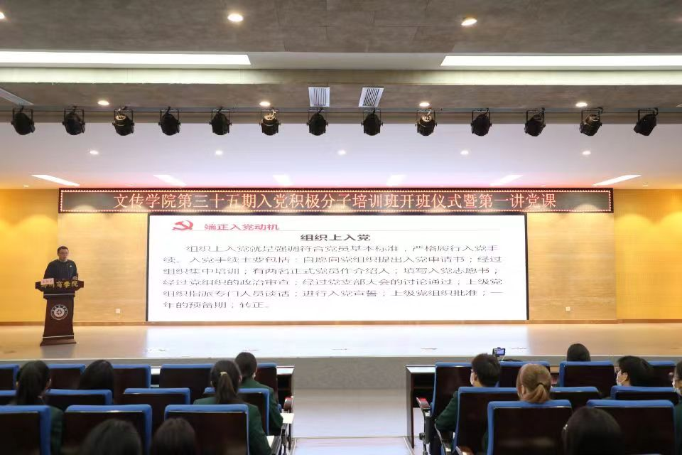 为坚持标准,提高质量,把好党员发展“入口关”,文传学院于10月14日在自力楼三楼报告厅举行“第三十五期积极分子培训班开班仪式暨党课第一讲”。文传学院党委书记贾蓓、团委书记王凯、各学生党支部书记及第三十五期入党积极分子共同参加开班仪式,会议由潘亚萍老师主持,此次会议严格遵守疫情防控原则,全体师生佩戴口罩,隔一坐一。