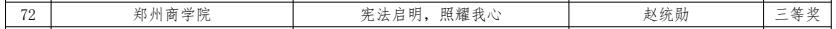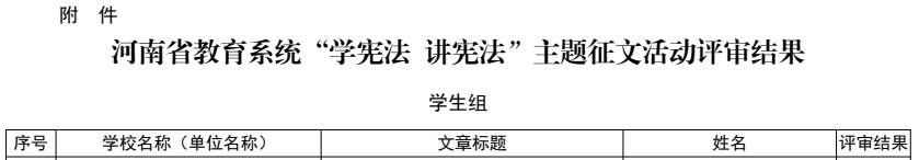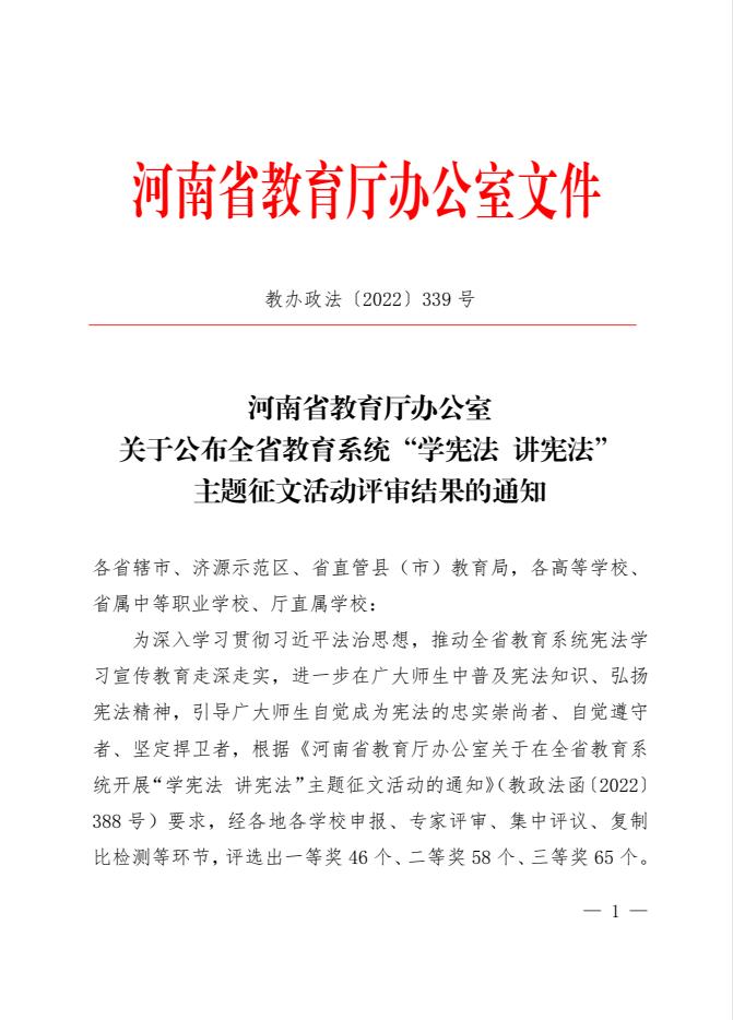 为深入学习贯彻习近平法治思想,推动全省教育系统宪法学习宣传教育走深走实,进一步在广大师生中普及宪法知识、弘扬宪法精神,引导广大师生自觉成为宪法的忠实崇尚者、自觉遵守者、坚定捍卫者,2022年8月举办了河南省教育厅“学宪法 讲宪法”征文活动,经各地各学校申报、专家评审、集中评议、检测等环节,评选出一等奖 46 个、二等奖 58 个、三等奖 65 个。
