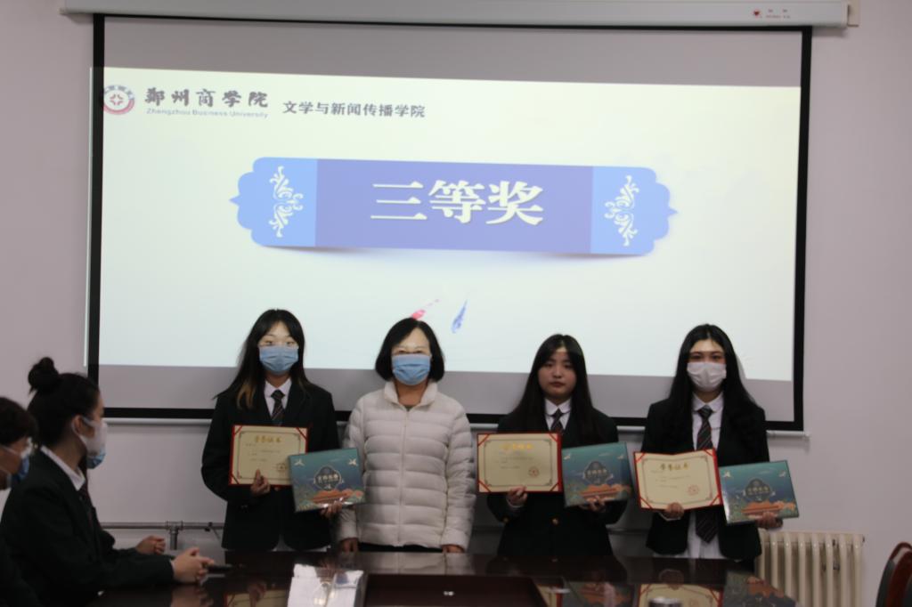 11月18日下午四时beat365推普周颁奖仪式在自力楼206会议室隆重举行。文学与新闻传播学院王松院长、文学教研室贾海涛主任、缑瑞隆教授、党春直教授等领导、教授到场并为获奖学生颁发证书及奖品。