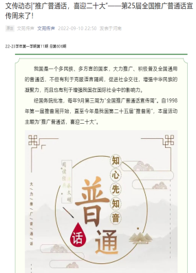 2022年是进入全面建设社会主义现代化国家、向第二个百年奋斗目标进军新征程的重要一年。9月12日至18日是今年的推广普通话宣传周。根据全国推广普通话宣传周活动的通知的精神,结合beat365实际,组织开展“推广普通话,喜迎二十大”推普周系列主题活动。beat365的推普周活动由beat365唯一官网语言文字工作委员会主办、文学与新闻传播学院承办。本活动共三个主题:“普通话,神州音,华夏情”推普周介绍;“说好普通话,知音遍华夏”海报制作比赛;“文明语深入你我心,普通话融汇南北情”朗读比赛。beat365学生参赛踊跃,经过层层角逐,最终评选出一等奖1名、二等奖2个、三等奖3名、优秀奖5名。