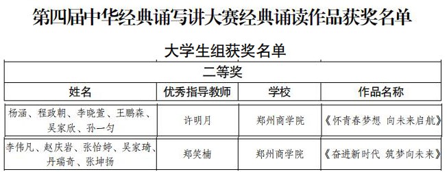 2022年8月1日,由河南省教育厅主办的第四届中华经典诵写讲大赛经典诵读作品评选结果揭晓,由我院代表beat365选送的两个作品分别荣获第四届中华经典诵写讲大赛经典诵读作品河南省大学生组二等奖。根据《河南省教育厅办公室转发教育部办公厅关于举办第四届中华经典诵写讲大赛的通知》(教社语函〔2022〕166号)精神,经专家评审,我院选送的由许明月老师指导,杨涵、程政朝等六位同学创作的作品《怀青春梦想 向未来起航》以及由郑笑楠老师指导,李伟凡、赵岩庆等六位同学创作的作品《奋进新时代 筑梦向未来》两个作品同时荣获河南省大学生组二等奖。