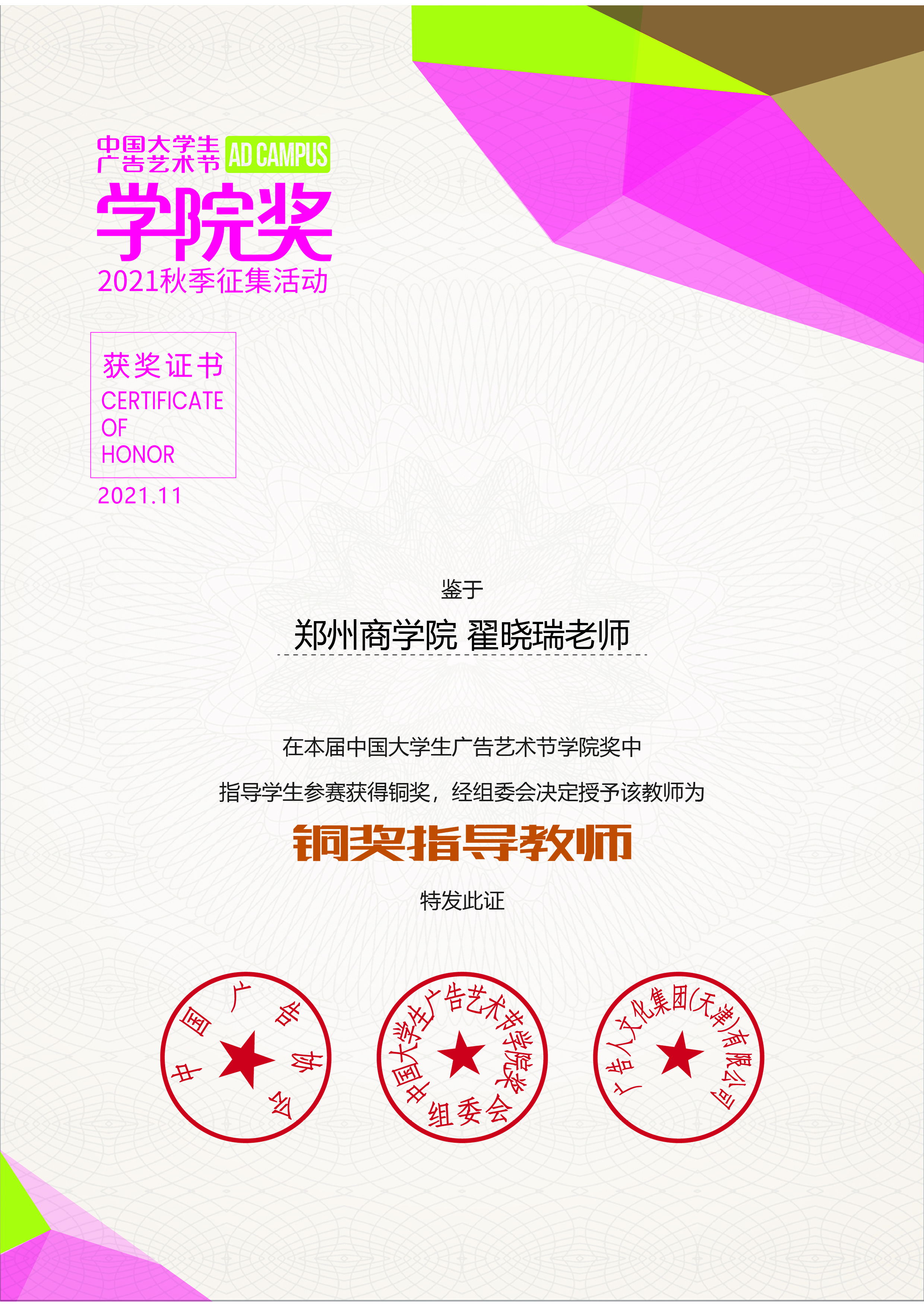 2021年12月,中国大学生广告艺术节学院奖2021秋季征集活动青春盛典在厦门国际会展中心圆满落幕。我院教师翟晓瑞、王梅灵同仁分别荣获“铜奖指导教师”“银奖指导教师”称号。中国大学生广告艺术节是目前国内唯一由国家工商总局批准、中国广告协会主办的大学生广告艺术大型活动。“学院奖”是中国大学生广告艺术节的核心项目。该奖项1999年创办,迄今已有22年历史。