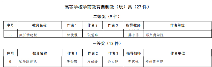 2022年8月8日,由河南省教育厅主办的第十九届河南省中小学幼儿园自制教(玩)具暨学生科技创新小制作小发明评选活动评选结果揭晓,由我院选送的两个作品《疯狂动物城》《魔法跳跳毯》分别荣获高等学校学前教育自制教(玩)具二等奖、三等奖。根据省教育厅办公室《关于开展第十九届河南省中小学幼儿园自制教(玩)具暨学生科技创新小制作小发明评选活动的通知》(教办技装〔2021〕358号)文件精神,我院高度重视本次比赛,自下发文件起积极组织学生参与,组织初选,并层层选拔。经过评审,最终确定由滕菲菲老师指导,韩慢慢、张慧琳制作的《疯狂动物城》,由李艺帆老师指导,李金璐、马祯媛、余文静制作的《魔法跳跳毯》参加比赛。在制作过程中,通过邀请幼儿体验玩教具的使用过程,发现教具设计的问题并加以补充完善,精心录制教具使用视频,最终参加评选。