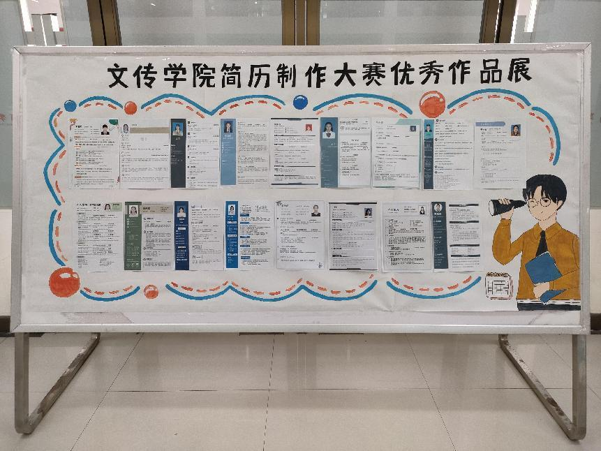 本次大赛包括各初赛、复赛和决赛三个阶段。首先,学生制作的简历经过初赛与复赛的层层选拔后,选出了五十份优秀简历进入决赛。决赛过程中,由文传学院就业专员王凯文老师进行决赛评选,选出十佳简历和优秀简历二十份。我们将优秀的简历作品张贴在展板上,在自力楼一楼大厅展示,让同学们参观学习。