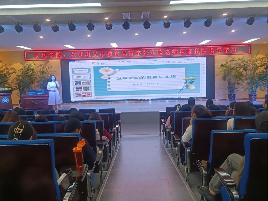 2023年6月13日,我院邀请巩义市教育局督学张东晓老师为学前教育专业的全体学生进行专业实习讲座,主题为《区域活动的设置与实施》。
