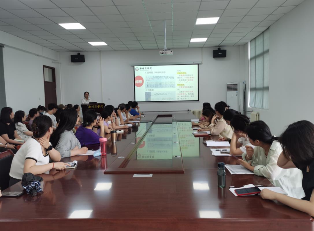为加强期末考试工作,切实保证学院期末相关工作有序进行,规范试卷归档资料,严明考试考场纪律,提高监考巡考规范性,进一步增强我院教学质量和做好期末考试工作安排,2023年6月19日下午,文传学院在自力楼216举行2022-2023学年第二学期期末考试工作专题培训会。会议由副院长张慧、教学秘书刘洋、教学质量监控督导员胡慧娟及全体无课教师参加。
