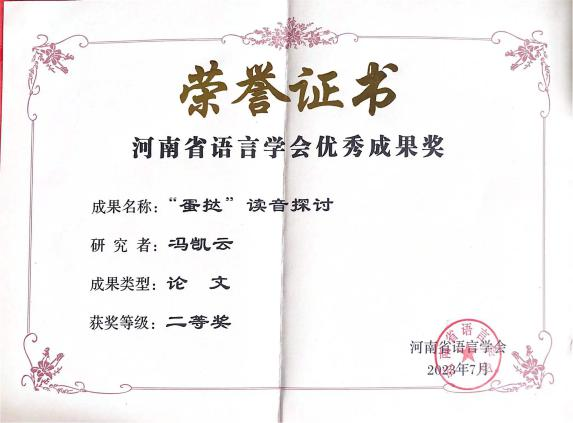 我院青年教师冯凯云的论文《“蛋挞”读音探析》获得河南省语言学会优秀论文“二等奖”。