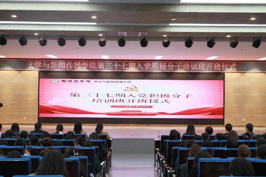 为深入学习贯彻习近平新时代中国特色社会主义思想,提高入党积极分子的政治觉悟,做好新时代发展党员工作,10月16日18时,文传学院于自力楼三楼报告厅举行“第三十七期入党积极分子培训班开班仪式”。我院党委书记贾蓓、团委书记王凯、全体辅导员老师以及第三十七期入党积极分子共同参加开班仪式,会议由程斯佳老师主持。
