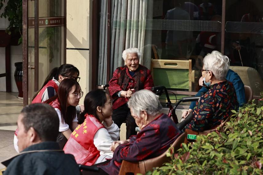 到达瑞康颐养院后,支部成员在负责老师唐帅菲、温舒涵和张明月的带领下,与老人们进行互动娱乐。其中有对拍瑜伽球、投壶、一起做手指操、唱红歌,推着老人去晒晒太阳、陪老人聊聊天等项目。活动最后,志愿者和老人们合影留念,记录下了这美好的一刻。