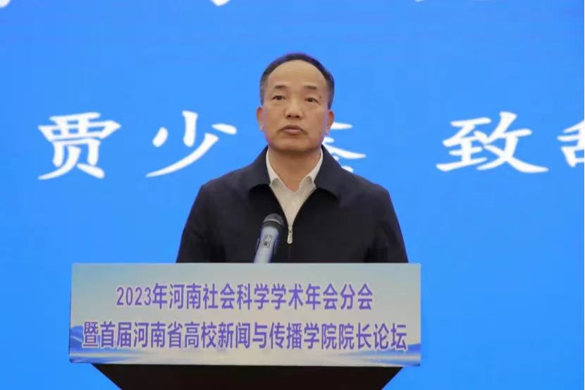 中原工学院党委书记贾少鑫代表学校对河南省传播学会传媒技术专业委员会的成立表示热烈祝贺。贾少鑫在致辞中向与会嘉宾介绍了中原工学院的办学历史与规模、教育教学、学科建设等情况,对中原工学院作为传媒技术专业委员会牵头单位表示感谢,希望专委会密切关注传媒技术发展动态,充分发挥新闻与传播学院的学科专业优势,开展高质量传媒技术研究,加强与传媒机构、业界先进技术厂商、高校和科研院所等机构之间的联系,搭建技术合作与学术交流的平台,共同研究和解决信息传播发展中的技术和实践问题,服务国家战略需求,助力河南文化强省和科技强省战略的实施。