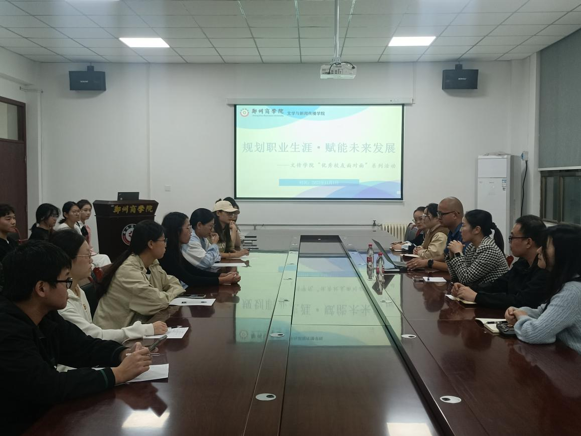 为全面落实立德树人根本任务,整合校友资源,发挥优秀校友的榜样引领作用,激励和引导学院广大同学端正学习态度,明确就业方向。11月1日晚,我院于自力楼216开展“优秀校友面对面”系列活动。本次邀请的是我院2011届优秀毕业生郎霖,目前就职于河南大象融媒体集团有限公司—全媒体营销策划中心。我院党委书记贾蓓、就业专员王凯文及广告、新闻专业辅导员和学生代表参会。
