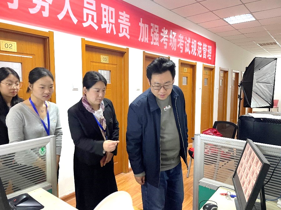 测试当天,校语委副主任王松与考务组成员一同巡视了考场,向考务工作人员详细询问了考场安排、人员配置等具体情况。