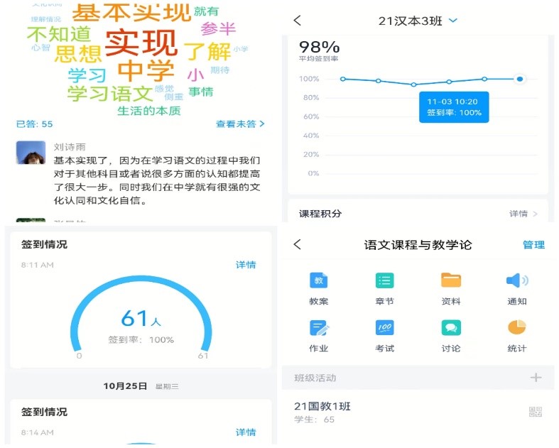 值得一提的是,张君凤老师能做到把“课程思政”浸润到课堂教学活动中,注重引导学生在学习和今后工作实践中善于思考、敢于尝试、勇于创新的学习态度和语文教师职业素养。此外,张君凤老师还充分利用“超星学习通”平台,开展考勤、课堂讨论、课程调研、问卷调查、作业提交等,极大的提高了课堂效率。