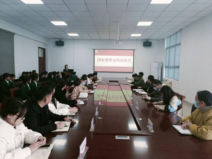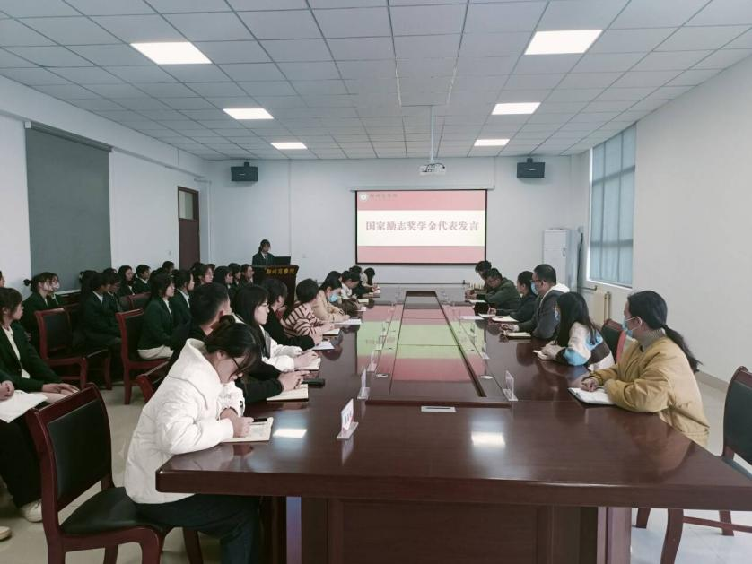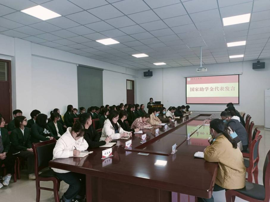 随后,国家奖学金获得者代表20汉本4班刘迎春、国家励志奖学金获得者代表21汉本5班沈文田、国家助学金获得者代表22汉本2班冯玉分别进行了发言。他们言辞恳切,十分感谢学校的关心和帮助,并表示一定会做一个懂得感恩、自强不息、信念坚定的人。