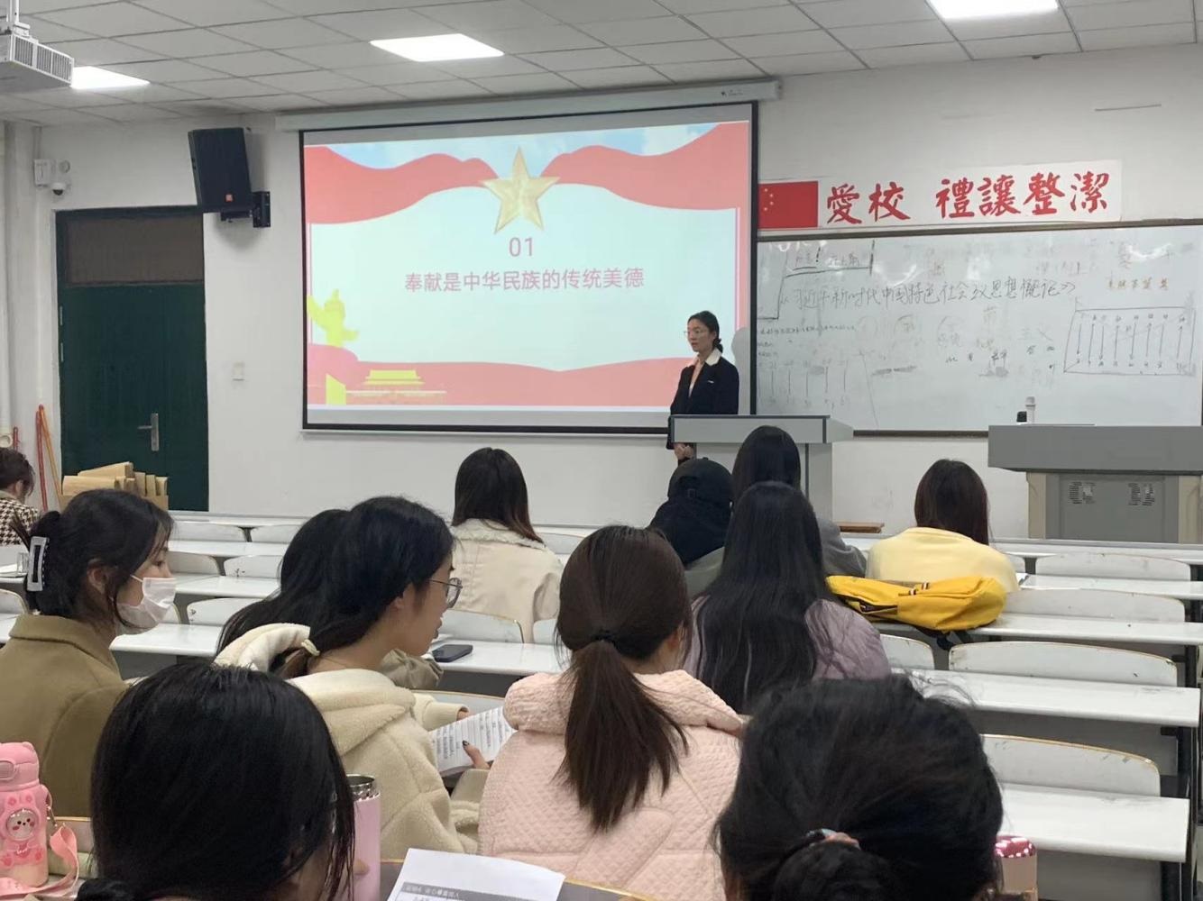 在理论宣传岗上,学生第一党支部韩卓琳同学在11月23日下午于艺术楼218教室针对班级54名同学开展了主题为“弘扬新时代奉献精神”的理论宣传活动。在宣讲过程中讲了“奉献是中华民族的传统美德”、“弘扬奉献精神是新时代的强烈呼唤”“争做甘于奉献的新时代党员”。通过此次活动,让同学们了解到奉献是我们党的鲜明底色,是共产党人的重要精神特质。让同学们感受到了党的奉献精神,增强了对党的奉献精神的理解和传播能力。党员宣传的核心任务是向群众传递党的声音,引导群众正确理解党的政策和战略,增强党的凝聚力和战斗力。