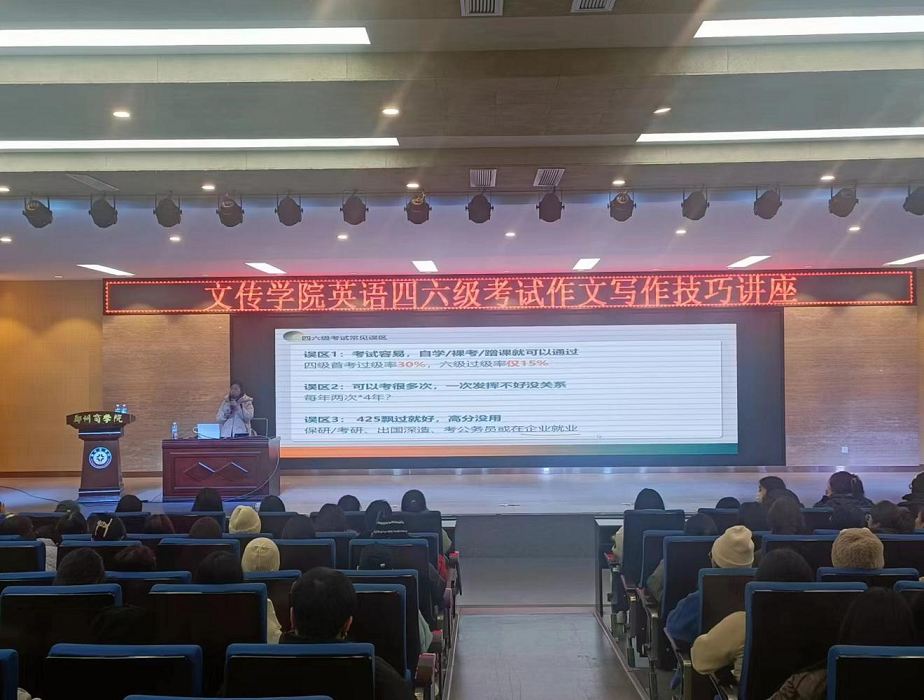 为帮助同学们更好备考大学生英语四六级考试,切实提升我院学生英语四六级考试通过率,12月13日下午,我院于自力楼三楼报告厅举办英语四六级考试作文写作技巧讲座,我院特邀四六级专业讲师肖晓艳主讲。