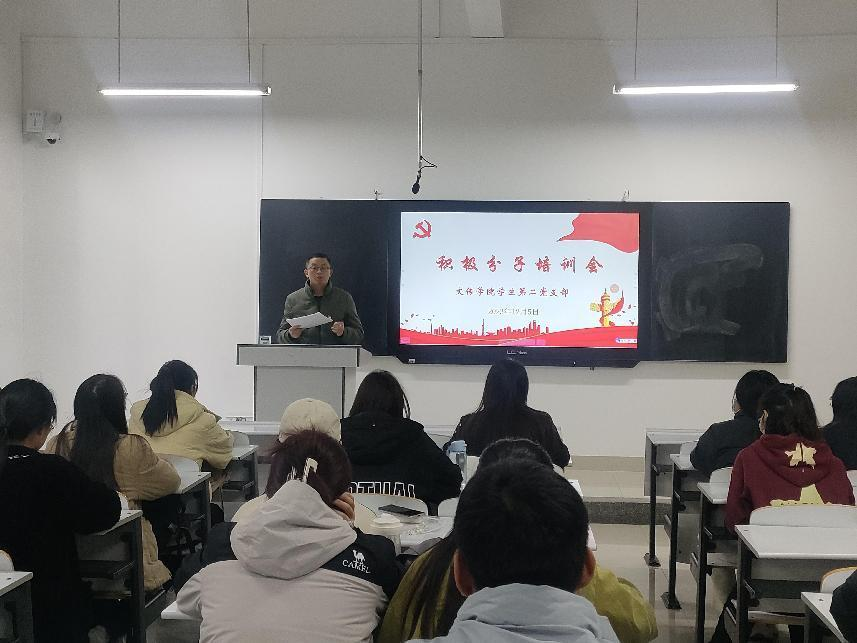 为深入学习贯彻习近平新时代中国特色社会主义思想,进一步完善入党积极分子培养教育,建设高素质学生党员队伍。12月15日中午,文传学院学生第二党支部于自力楼207召开积极分子培训会。本次会议由支部书记牛道恒老师主持,全体积极分子参会。