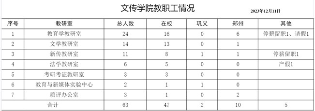 暴雪天气下,受道路交通影响,我院部分巩义地区以外教师无法正常返校。学院第一时间对教职工信息进行全面摸排,对非在校教师的信息进行动态更新,鼓励教师在确保自身安全的前提下尽快返校。截止12月11日中午12点,我院专职教师已全部返岗,确保正常教学。对不能返岗的兼职教师,学院于11日下午迅速启动线上教学。据统计,本周我院进行线上教学兼职教师共计27人,涉及课程23门次,涵盖70个班级,学生共计5390人。