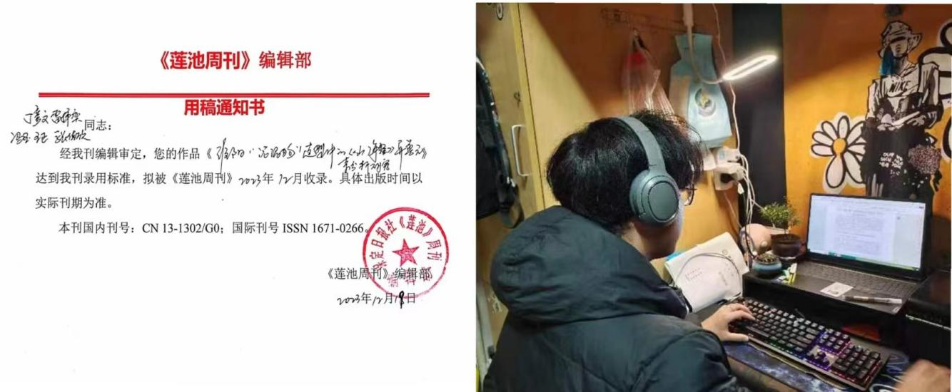 在创新创业岗上,学生第五党支部丁彦文同学的作品《淮阳“泥泥狗”造型中的〈山海经〉异兽元素分析研究》被《莲池周刊》在2023年12月成功收录,后续将会出版以供读者参考借鉴。他立足岗位特色,结合自己的专业技能和兴趣特长参与到大学生创新创业项目中去,与团队成员分工合作,通过查阅大量的文献资料以及项目的研究内容和实验结果,完成论文的编写工作,并进行反复的修改和讨论确保论文的逻辑准确性和内容完整性,这也体现了他精益求精,严谨负责的做事风格。在后续工作中,他与团队成员根据研究领域向期刊投稿,并按照审稿意见不断修改和完善,功夫不负有心人,经过丁彦文同志与团队成员的不懈努力,论文最终被收录出版。