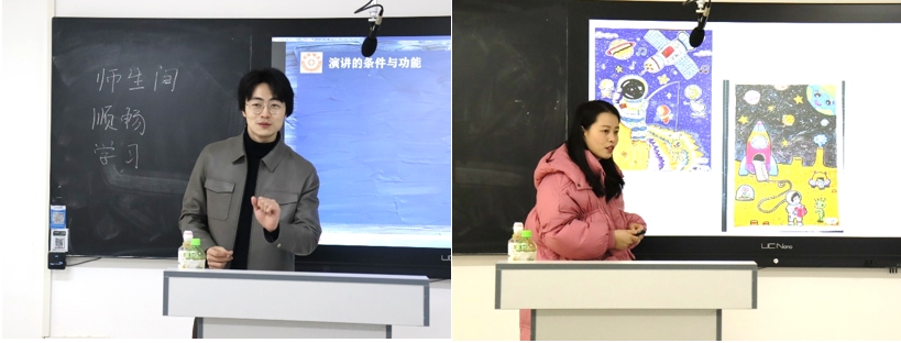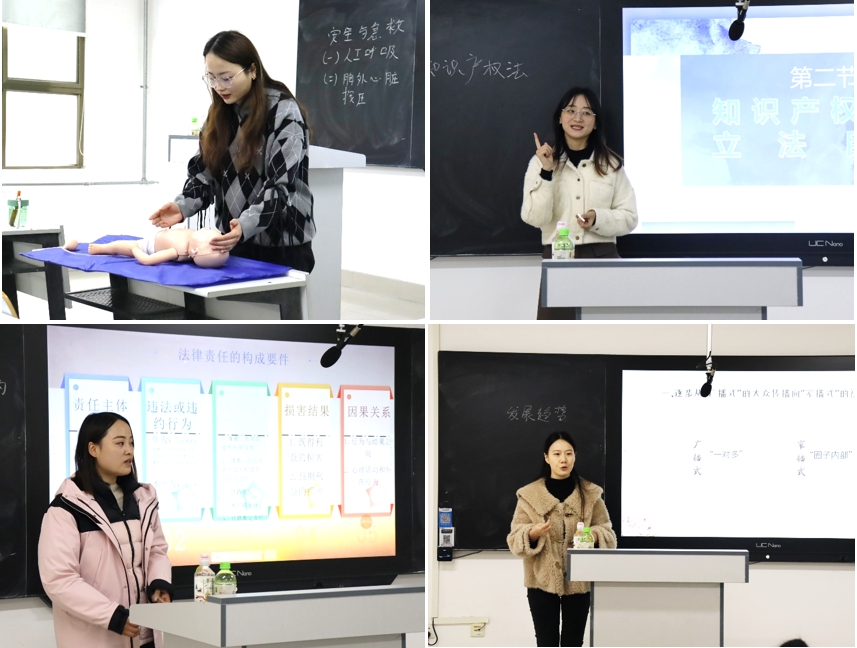 毕梦真老师带来的课程是《安全与急救处理》,通过展示急救方式视频和现场演示将成人和幼儿的急救方法传授给大家;郑璐璐老师带来的课程是《知识产权法的立法目的》,通过游戏、小说、电视剧等丰富新颖的案例,向大家解释了知识产权法的立法目的,并引出要保护知识财产和促进知识财产利用的话题。李二红老师带来的课程为《法律责任的构成》,区分了“责任”和“法律责任”的概念,通过五方面全方位地解释了法律责任的构成;宋秀老师结合现下时代发展的趋势,带来课程《网络流行语的发展趋势》,通过贴近大学生日常生活的案例,讲述了三种网络流行词的发展趋势;荆晨阳老师教授的课程是《演讲与辩论》,通过与学生深度交流将演讲的条件和功能展示给大家,并通过各种图片解释课程重点;王静静老师以“幼儿教师概述、幼儿教师劳动的特点”为核心,重点梳理了幼儿教师的含义与资格、幼儿教师的权力与职责、幼儿教师劳动的特点等重要知识点;祁小艳老师在教学过程中,给学生放一些中外跨文化交际的视频,让学生对比中外异同;杜微微老师围绕甲骨文“卜辞”这一教学难点,完整地介绍了甲骨文的形成过程,使学生增加了民族文化的自信心。大赛经过激烈的角逐,王静静、宋秀老师荣获晋级校赛资格。