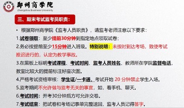 为加强考核过程管理,保证期末考试能够平稳进行,首先强化考场规则与监考职责考前提醒。在考前一周召开全院教职工会议,将学校考场规则与教师监考职责相关文件传达到位,并发送至学院内部群,供全体教师浏览学习,确保期末考试能够有序开展。其次加强考试周督查巡查工作。在考试期间,在副院长石璐带领下,我院教学质量监控小组组织对考试课监考工作进行了重点巡查。