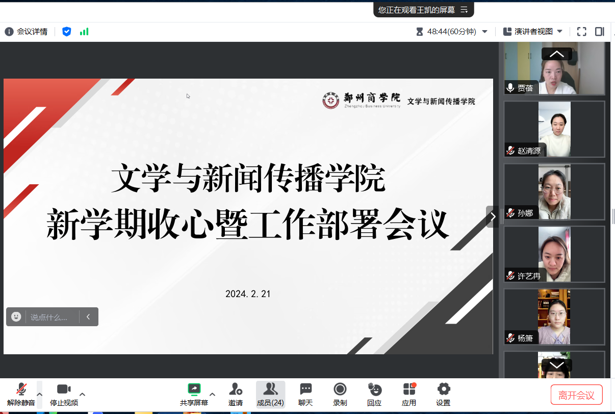 为进一步梳理、明确新学期学生工作重点与任务目标,精准把握学生工作新形势与新任务,确保文传学院各项工作顺利开展。2月21日,文传学院线上组织召开新学期收心暨工作部署会议,文传学院党委书记贾蓓、团委书记王凯及全体辅导员参会。