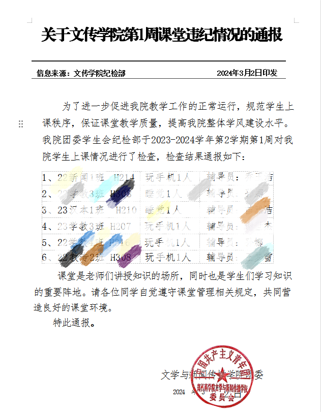 规范学生上课质量,每周持续对课堂违纪情况进行通报,帮助学生建立学习规矩,激发学生学习动力。