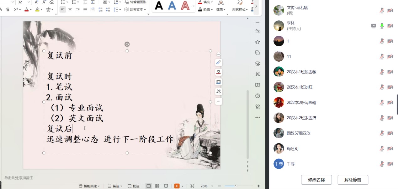 本次考研复试指导会圆满完成,同学们收获颇多。同时也希望同学们铭记:逐梦之路没有“躺赢”的可能,也没有“躺平”的捷径,唯有砥砺笃行,方能铸造理想的丰碑。预祝各位考研学子一路生花,顺利上岸!