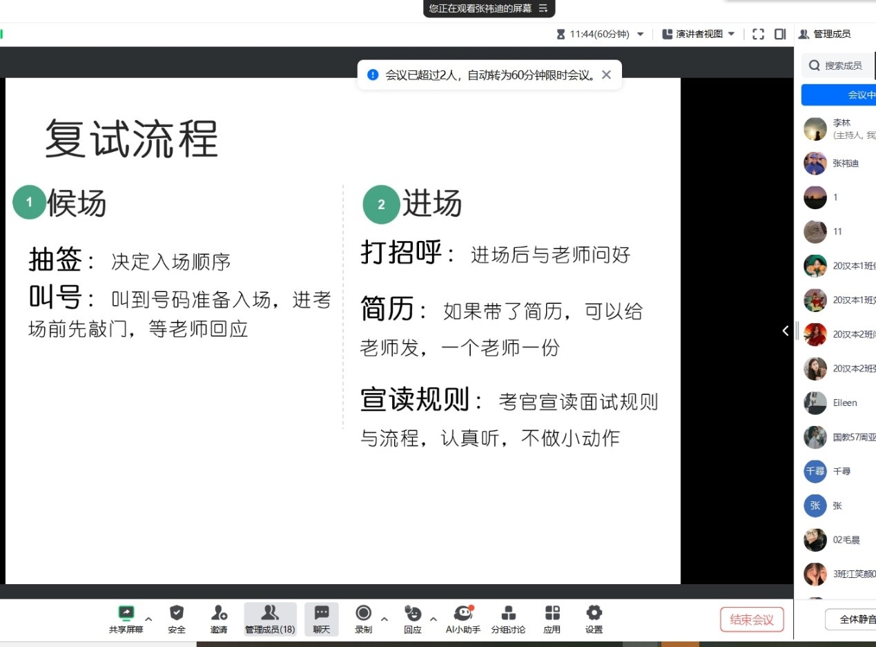 张祎迪作为2023年考研成功上岸的优秀学子,目前就读于河北大学汉语国际教育专业。此次复试经验分享会,张祎迪同学将考前准备、线下考试流程、考试考查内容等板块分别进行经验分享。在材料准备方面,她提醒同学们看清要求、突出重点;在考试流程方面要态度端正、保持热情礼貌;在考查内容上,她分享了自己的复试经验,提醒同学们考试中英语部分主要围绕基础常识或专业相关话题,专业课部分主要考查对于基础知识或拓展知识的理解。此外,张祎迪同学还从交流表达、自我介绍、突发情况等方面对注意事项进行说明。