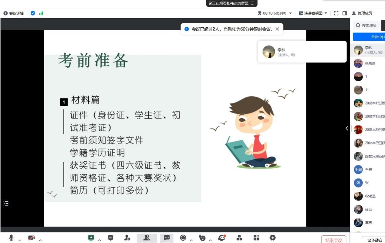 手握复试“入场券”,如何从众多考生中脱颖而出?为缓解考研学子的备考压力,3月13日,我院文学教研室主办了2024届语言文学类考研复试指导会。本次指导会由19级国教1班张祎迪同学及文学教研室李林林老师主讲。