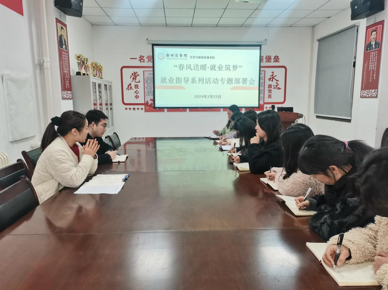 3月25日上午,文传学院召开“春风送暖·就业筑梦”就业指导系列活动专题部署会,文传学院党委书记贾蓓、团委书记王凯及各年级长参会。