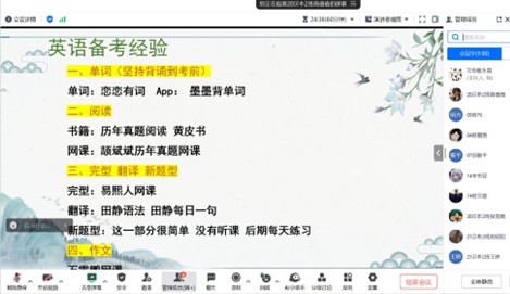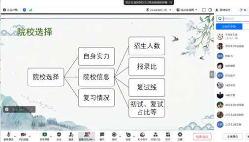 在英语备考、政治备考和专业课复习经验等内容上,四位同学都分板块传授了复习经验,告诉同学们复习的时间节点和复习要点及技巧。分享过程中,四位同学都提到一个词就是“坚持”,如果选择了考研这条道路,就要坚持,只要坚定信心、坚持到底,一定能成功“上岸”。