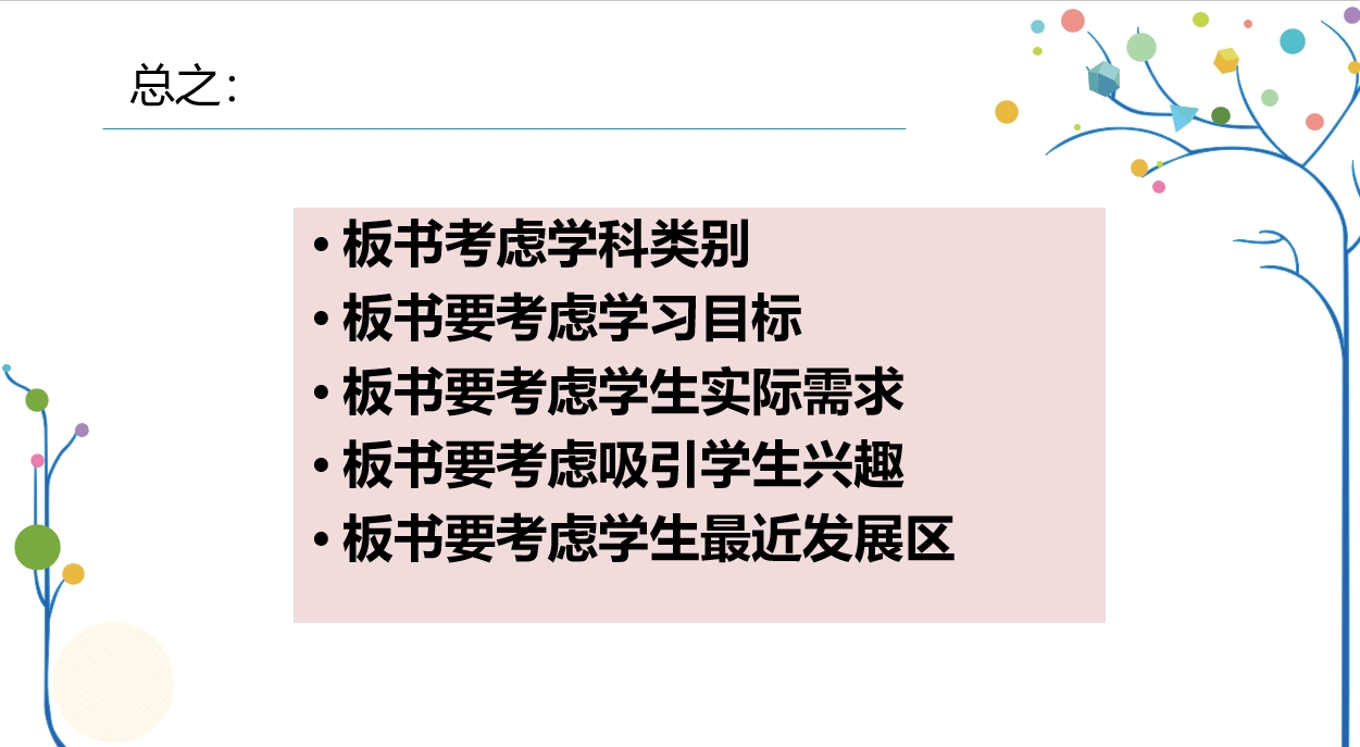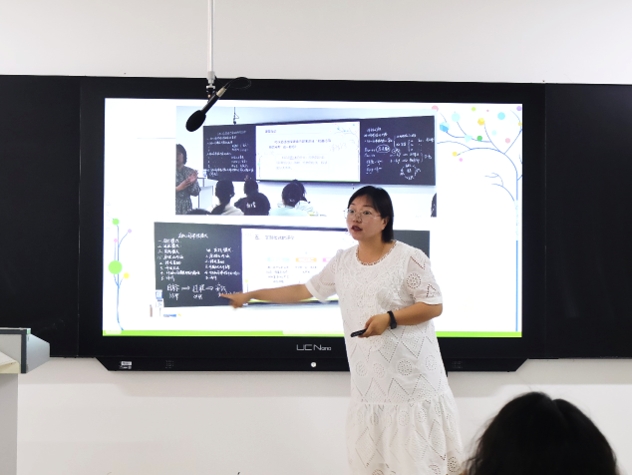 李玉萍老师结合自身授课经验分别从“课前构思好版位设计”、“板书内容设计”、“板书设计常用方法”三方面进行分享。板书版位需严谨布局,注意版面的大小,统筹规划,充分利用白板的有效面积,布局合理,主次分明;板书内容设计必须与讲解紧密结合,应与讲述内容统盘考虑,对写哪些内容,什么时机写,写在什么位置都应作周密合理地安排,使板书与讲解互相协调,相得益彰;板书设计常用方法包含摘录提纲法、概括归纳法、图形示意法、表格解释法,老师们需要结合自身课程,选用合适的方法来进行板书设计。