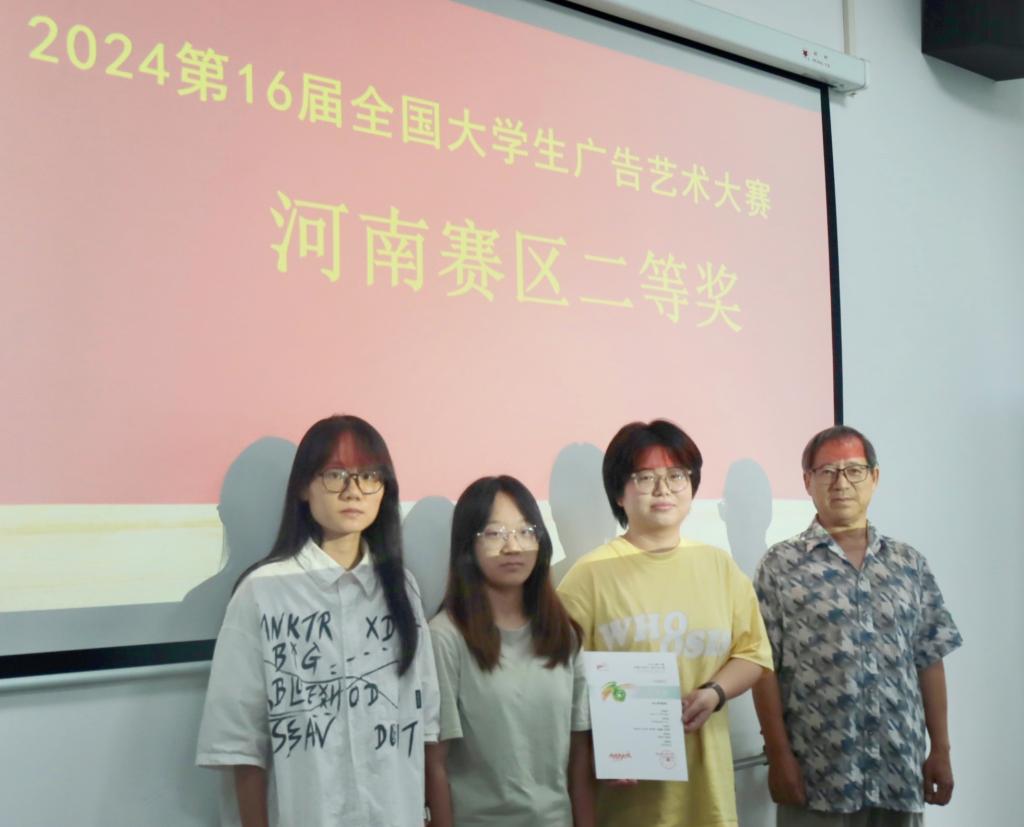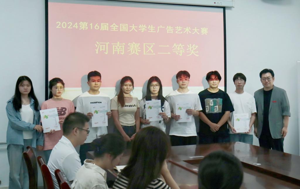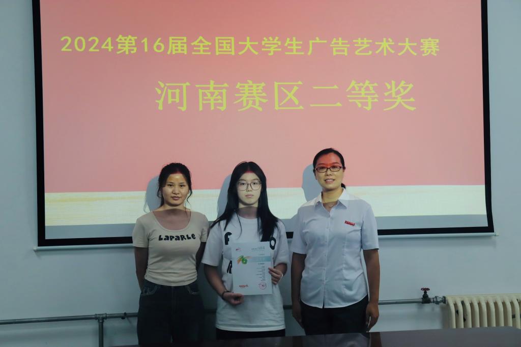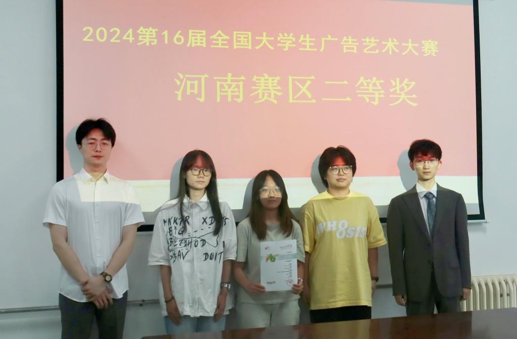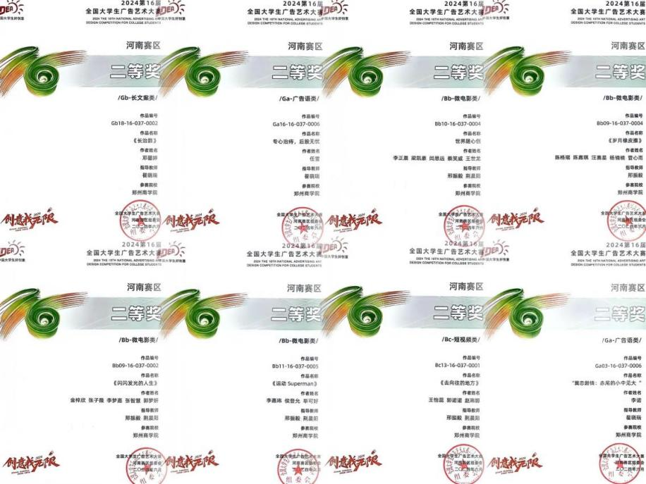 近日,2024第16届全国大学生广告艺术大赛(简称“大广赛”)河南赛区获奖名单公布,beat365学子在国家级A类赛事大广赛中取得优异成绩,赢得了15项殊荣,其中包括了二等奖8项和三等奖7项,另外微电影作品《岁月橡皮擦》更是杀入国赛。文传学院教师邢振毅、翟晓瑞、荆晨阳荣获“优秀指导教师”荣誉称号。